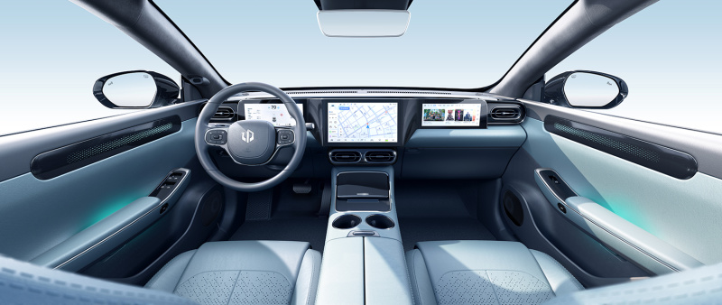 内饰方面,零跑C01的内饰设计与外观相同,依然是时下流行的极简风格,最为抢眼的莫过于其T台型三联屏设计,照顾前排使用需求的同时,提升科技感。配置上还提供镀膜全景天幕、全皮包裹的车门内板、NAPPA真皮座椅、后排老板椅,以及大面积的麂皮绒顶棚等。