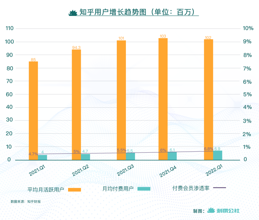 首先,知乎营收增长得益于在保持总体用户基数的基础上,付费会员渗透率的持续上升。2022年第一季度,知乎平均月活跃用户数为1.02亿,其中月均付费用户为690万,同比增长72.8%。从用户增长趋势来看,知乎的月均付费用户数始终保持较为平稳的增长,每个季度增长大约60万~80万。付费会员渗透率也从2021年第一季度的4.7%,平缓增长至最新财报数据的6.8%。