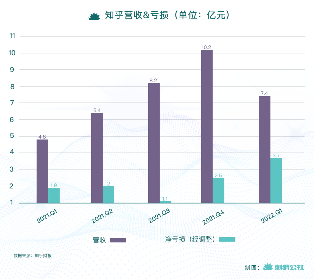回顾2021年一季度到四季度,知乎营收额持续增长,分别是4.8亿元、6.4亿元、8.2亿元、10.2亿元。2022年第一季度,知乎营收7.4亿元,同比增长55.4%、环比下降27.1%。