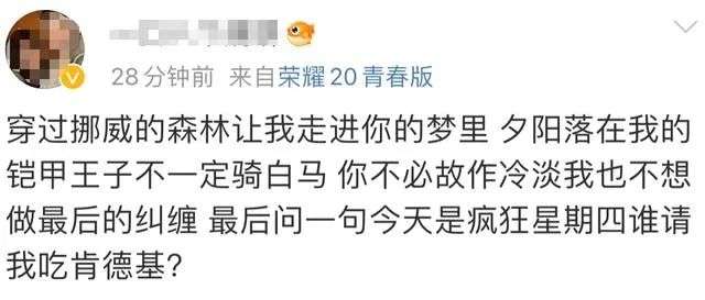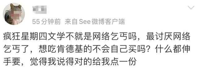 抒情风、文艺风、沙雕风......任何风格与热点配上一句“今天是疯狂星期四,你愿意请我吃肯德基吗?”都能组成“疯四文学”。