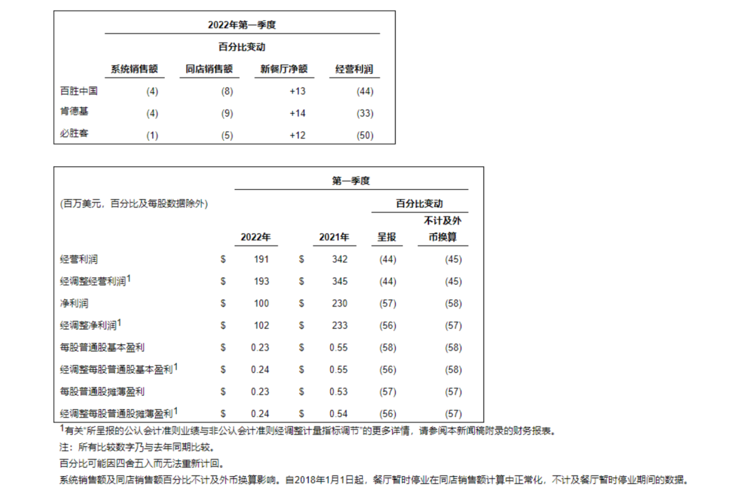 受疫情大环境影响,肯德基母公司百胜中国披露2022年第一季度业绩。今年第一季度,公司总收入26.7亿美元,同比(较上年同期)增长4%;净利润为1亿美元,同比下滑57%。