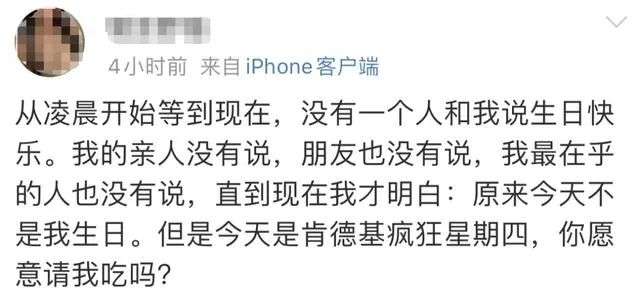 作为销售端的促销活动,“疯狂星期四”的本意是让利促销,结果阴差阳错之下,成为了时下最热的“互联网新潮”,一些想吃肯德基的朋友们在星期四发布一些魔幻且离谱的文案,并无一例外在结尾表达想让别人请自己吃肯德基的愿望,被广大网友称为“疯狂星期四文学”,又催生了一个新的族群“肯德基文学家”。
