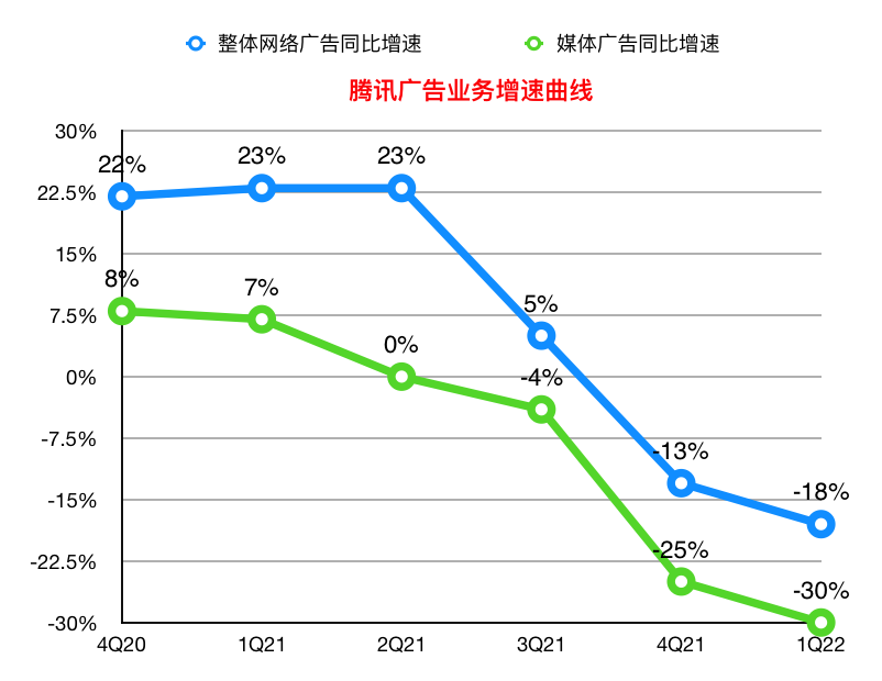 据最新发布的1Q22季度业绩,腾讯整个网络广告收入同比下降18%,其中社交广告下降15%至157亿元,媒体广告下降30%至23亿元。在媒体广告中,腾讯视频应该是大头,腾讯新闻是营收补充,但下滑幅度较大。