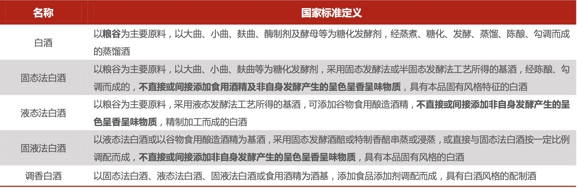 过去,无论是添加了食用酒精、香精勾调的固液法或液态法白酒,还是粮食酿造的就都可以叫白酒。但新国标实施后,只有以粮谷为主要原料,以大曲、小曲、麸曲、酶制剂及酵母等为糖化发酵剂,经蒸煮、糖化、发酵、蒸馏、陈酿、勾调而成的蒸馏酒,才能谓之白酒。