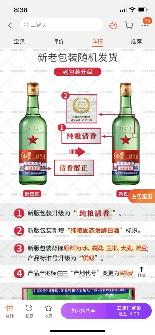 另一边,原本就采用传统工艺酿造的白酒则在包装和营销中强化“纯粮”的概念。比如56度红星二锅头,新包装上以“纯粮清香”替代原来的“清香醇正”,且增加了“纯粮固态发酵”的标志;新版原料表中也明确标注原料为:水、高粱、玉米、大麦、豌豆,产品标准号升级为“优级”。
