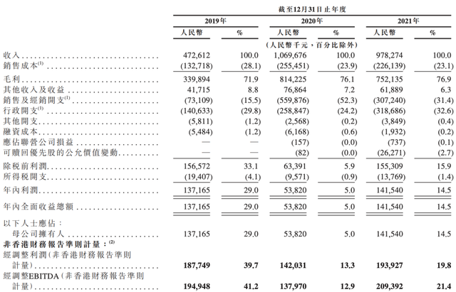 利润的变动,主要是销售及经销开支等大幅增加,2019年、2020年及2021年,公司分别产生了7300万元、5.6亿元及3.07亿元的营销成本,分别占同期总收入的15.5%、52.3%及31.4%。