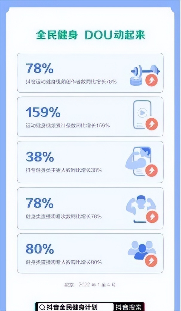 根据抖音发布的《抖音运动健身报告》,2022年1至4月,抖音平台运动健身视频创作者数同比增长78%,运动健身视频累计条数同比增长159%;健身类主播人数同比增长38%,健身类直播观看人数同比增长80%。