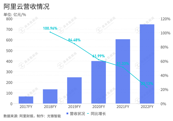 5月26日,阿里巴巴发布了截至2022年3月31日的2022财年第四季度及年度财报。报告显示,2022财年,阿里云在抵消跨分布交易(扣除来自为其他阿里巴巴业务提供服务的收入)的影响后总收入为745.68亿元,同比增长23%。