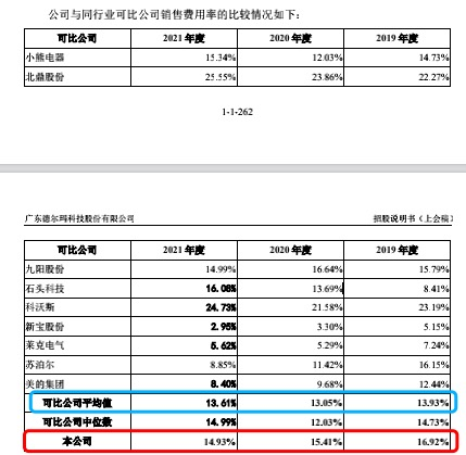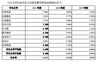 然而,德尔玛科技“轻研发重营销”趋势显现。据招股说明书,2019年-2021年,公司研发费用率分别为3.59%、3.36%、3.64%,低于可比公司研发费用率平均值;此外,最近三年公司销售费用率分别为16.92%、15.41%、14.93%,均高于可比公司销售费用率平均值。
