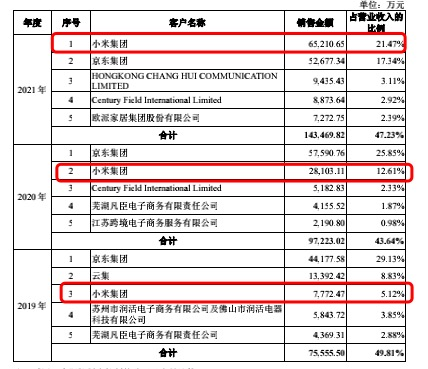 据招股说明书,2019年德尔玛对小米集团的销售额仅7772.47万元,到了2021年,该数字便大幅增加至6.52亿元,增幅接近8倍;对应销售额占据营业收入的比例从2019年5.12%飙升至2021年的21.47%,小米集团也随之从2019年的第三大客户跃升为第一大客户。