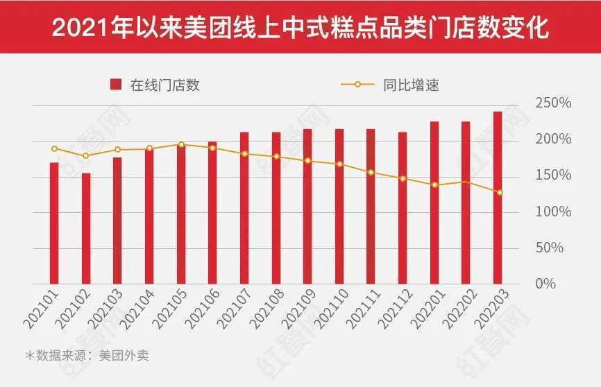 除了头部品牌,行业整体的发展势头也在下降。近日,美团外卖数据显示,虽然中式糕点线上门店总数增速仍超过100%,但较去年同期收窄明显。鉴于hon烘焙产品特性,大多数线下门店开设线上门店的比重非常大,我们姑且以此判断hon烘焙行业概况。