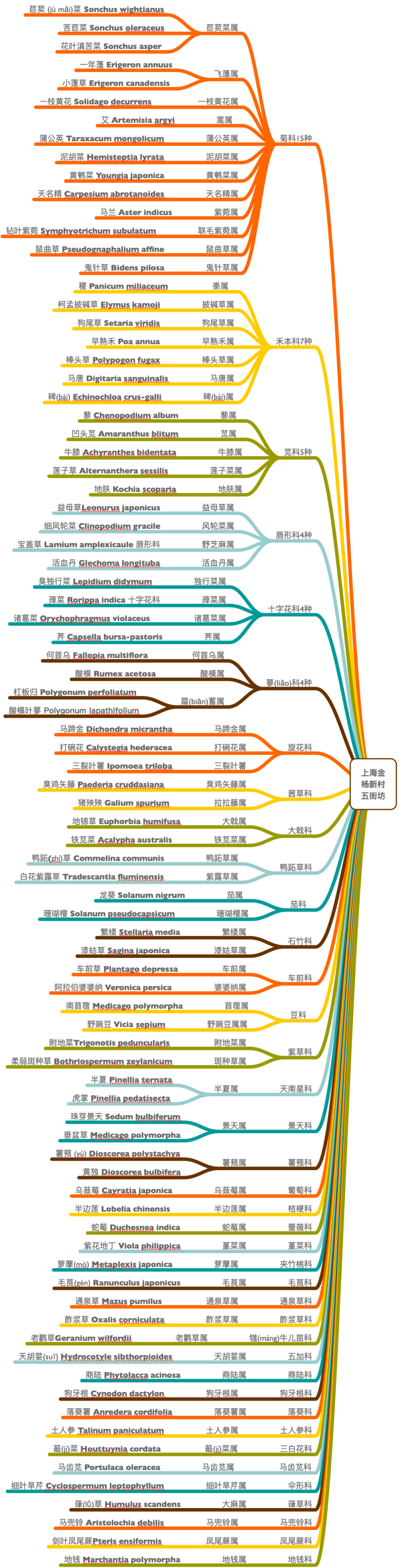 益母草,诸葛菜(二月兰),细风轮菜,宝盖草,活血丹,臭独行菜,蔊菜,酸模叶蓼,酸模,杠板归,何首乌,荠菜。