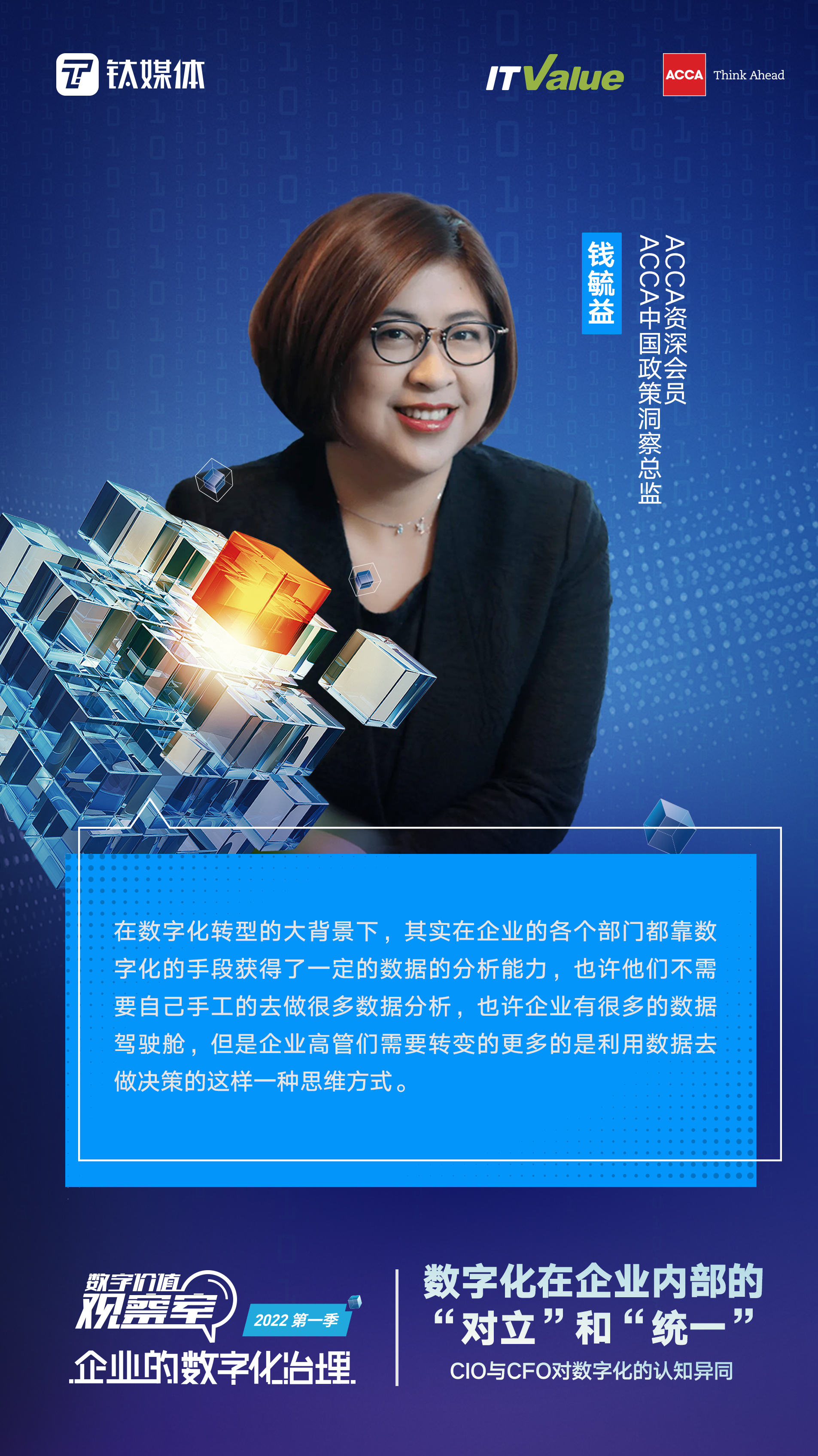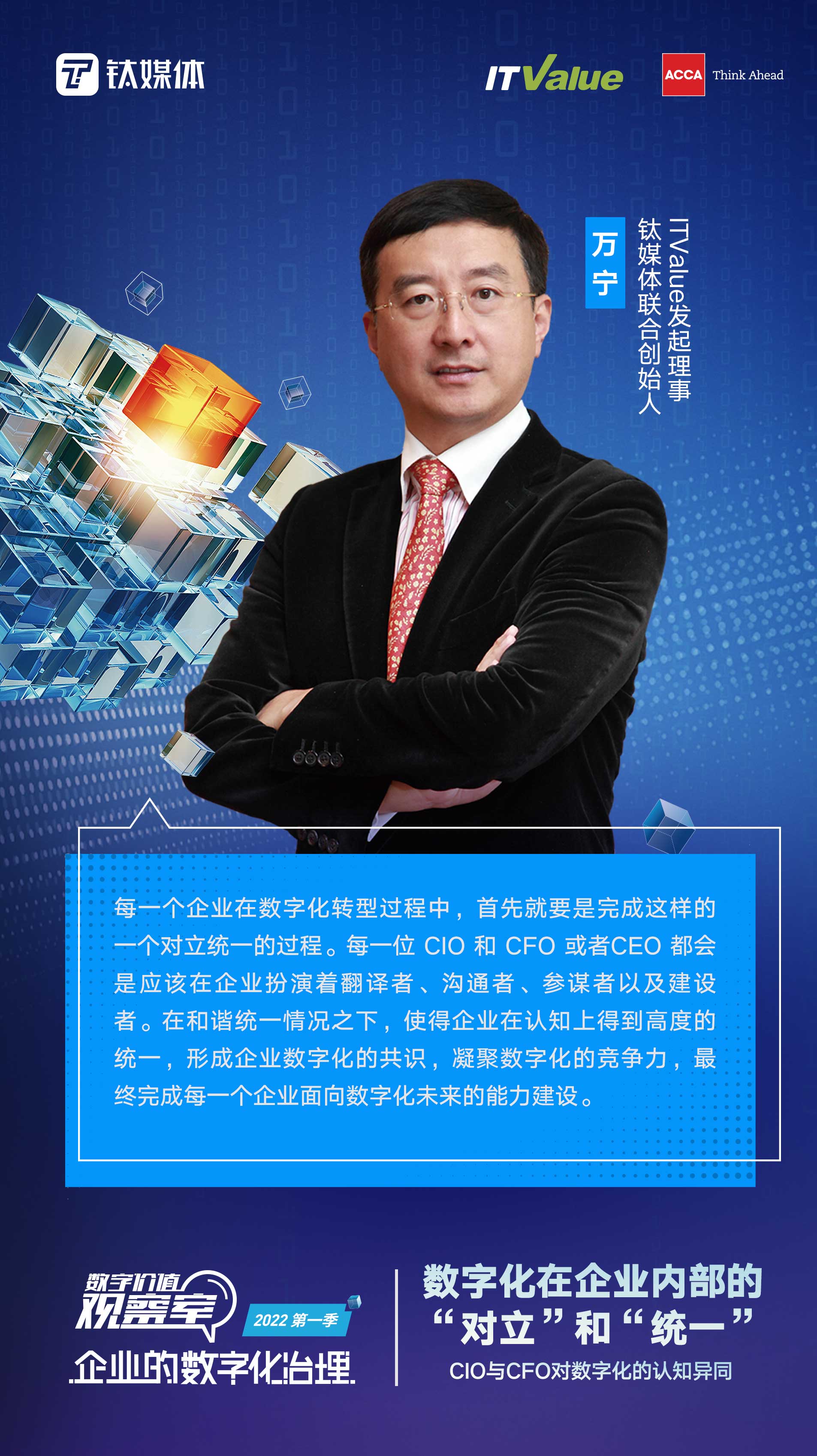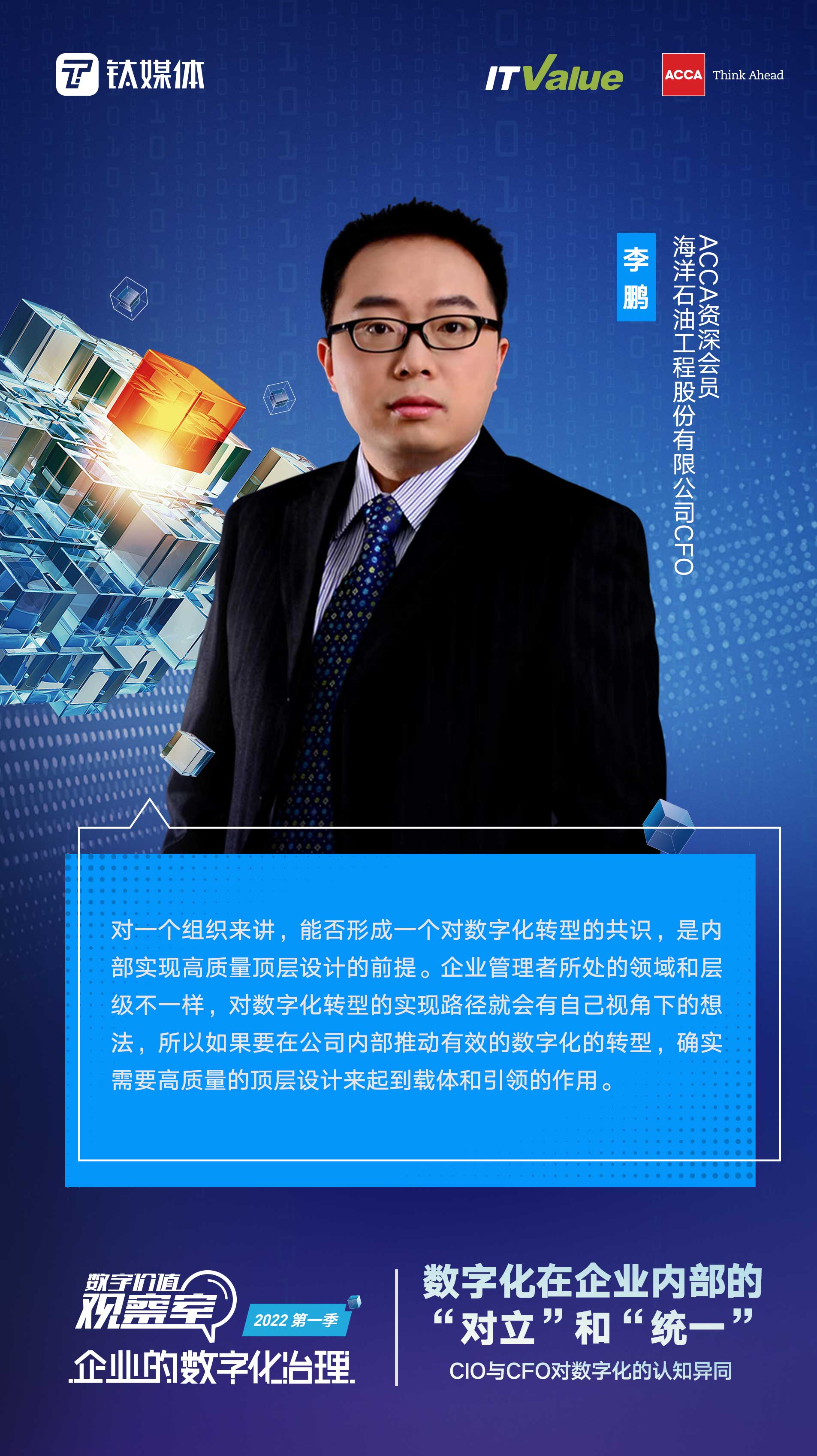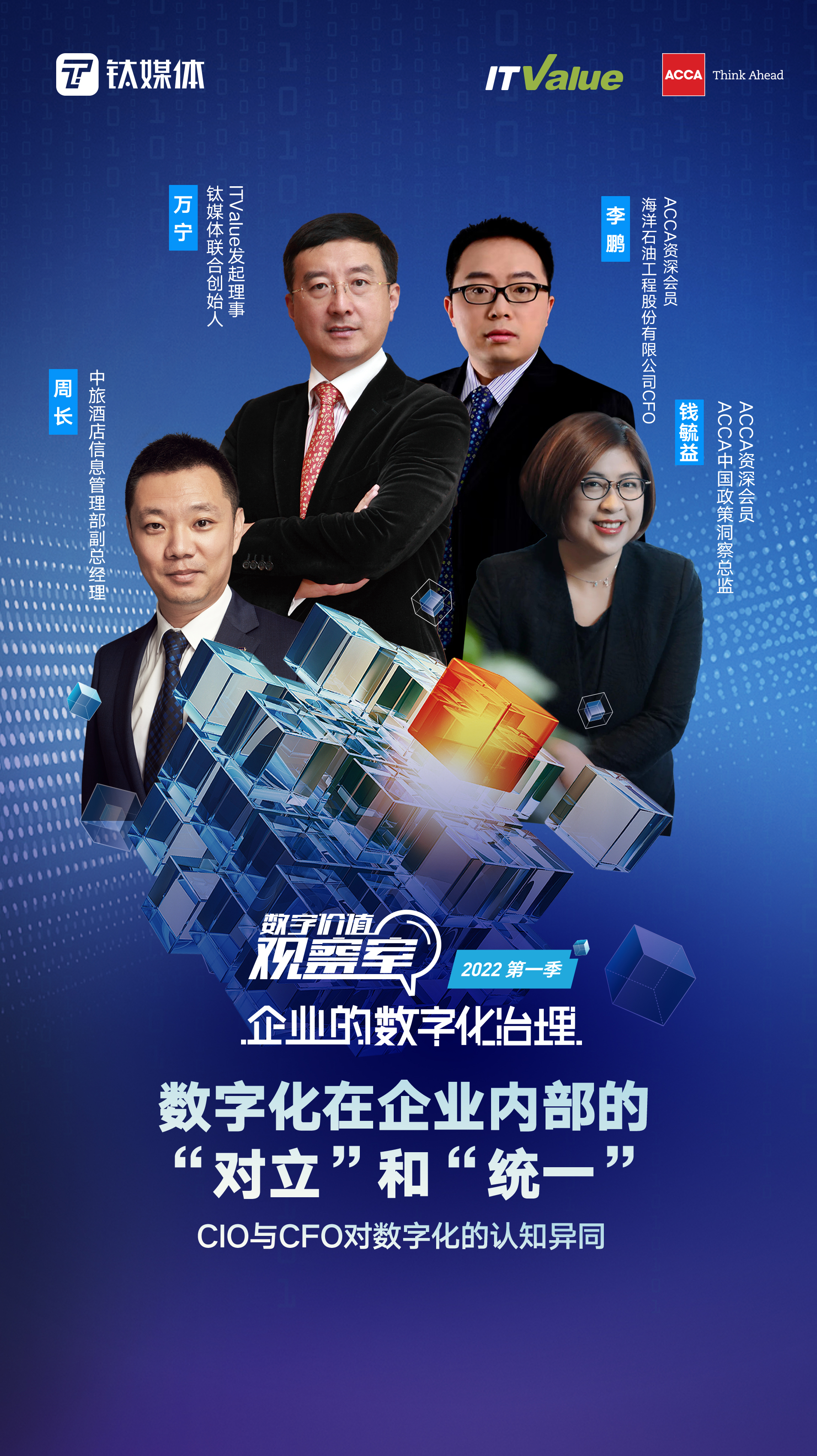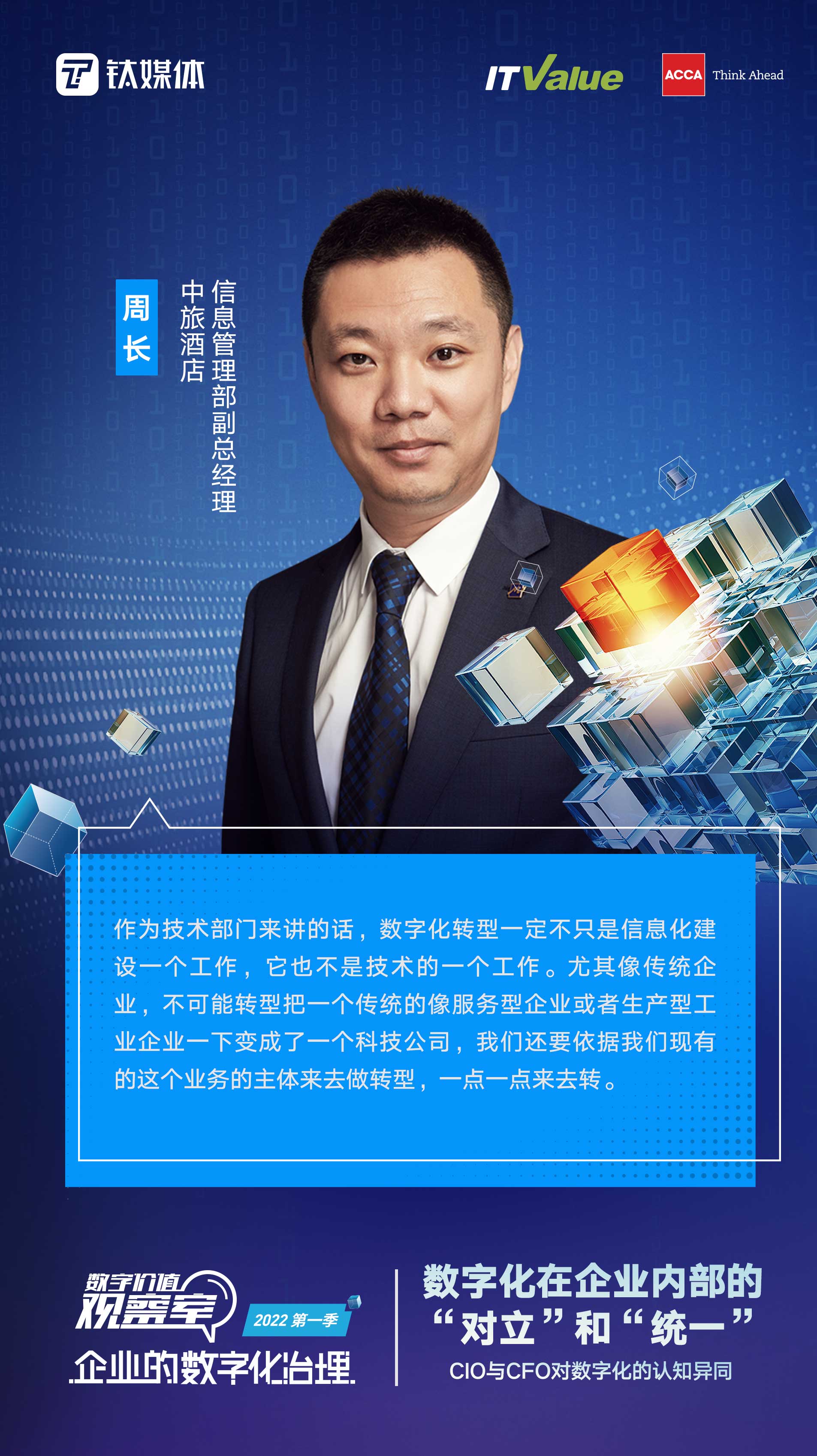 本期我们邀请到了中旅集团的周长总、海洋石油的李鹏总,还有特别连线了ACCA的研究总监钱毓益女士。希望能够通过这样的一个时空连线,大家对于企业在数字化内部的对立和统一展开探讨。