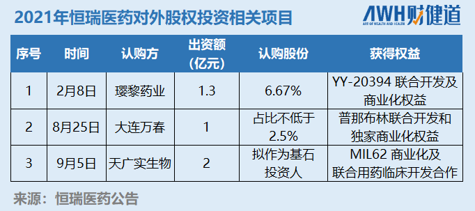 2021年恒瑞出手较为频繁,最让市场瞩目的是,恒瑞医药先后通过股权投资获得3款创新药的联合开发及商业化权益。![]()