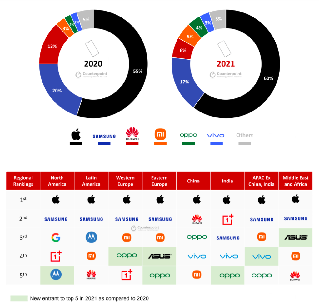 据知名市场调研机构Counterpoint发布的2021年度手机销量阅读报告中显示,在400美元以上的高端市场中,苹果以60%的市场份额“傲视群雄”,尤其在iPhone 12和iPhone 13系列的成功下,抢占了许多其他品牌的份额,在2021年Q4获得国内份额创下历史新高。