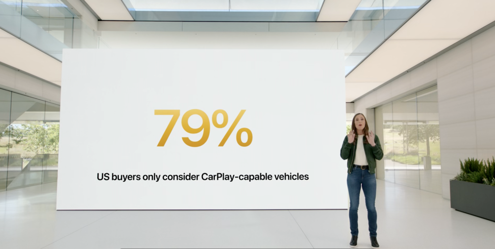 最后,苹果还对外公布了两个非常重要的数据:美国98%的车都可以使用Carplay,79%的美国消费者表示自己只会买支持Carplay的汽车。