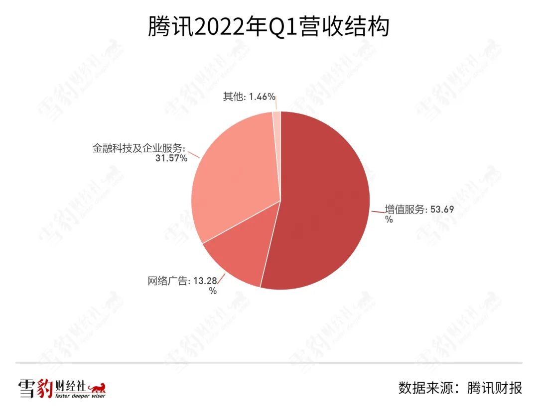 腾讯的营收三驾马车为增值业务、FBS(金融科技与企业服务)以及广告业务,占比最大的增值服务包含社交和游戏,但也仅占总营收的54%。