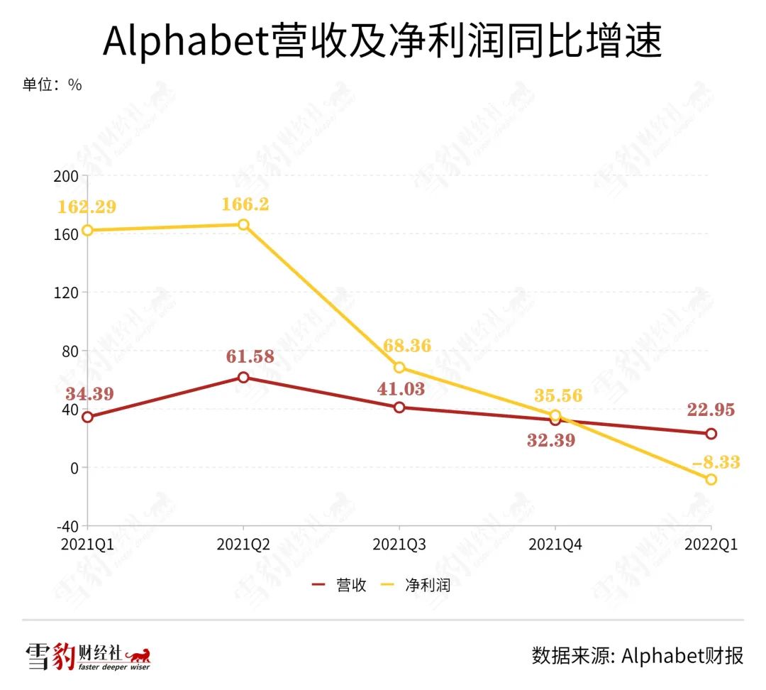 近年来,全球宏观经济下行,电商、教育等从前的广告投放大户纷纷收紧支出,广告行业整体遇冷。谷歌母公司Alphabet营收、净利润增速分别从2021年Q1的34.4%和162.3%,骤降至今年Q1的23%和-8.3%。