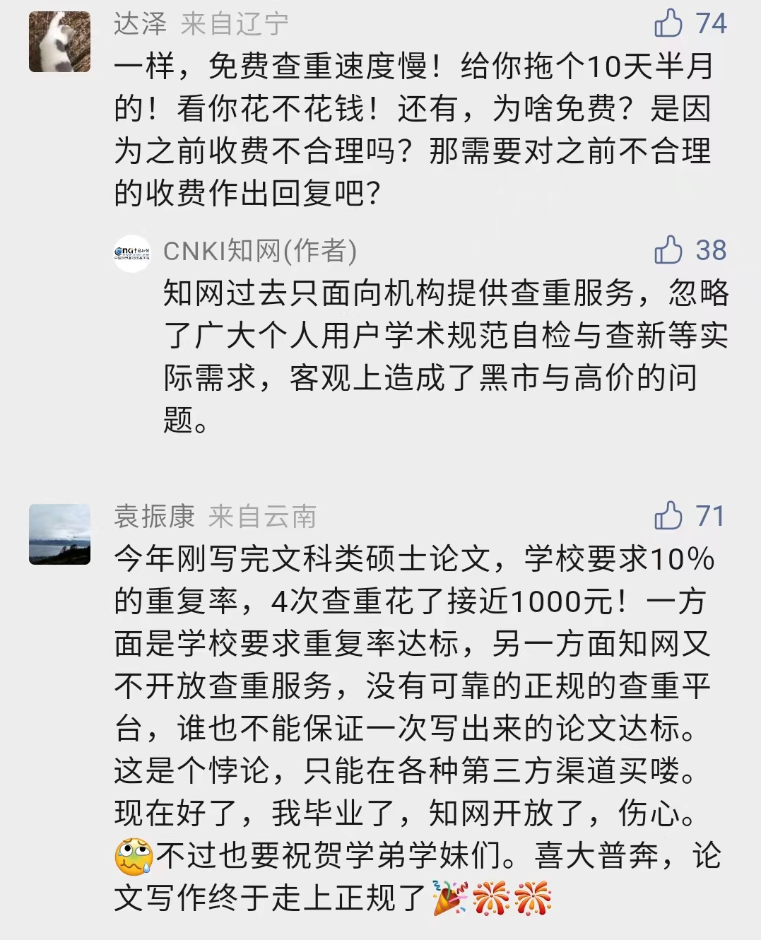 仅从知网公众号挑选的留言中,我们也可以看到大学生们苦“论文查重收费”久矣,论文查重几次,可能一个月的伙食费就没了,对经济尚不独立的大学生们来说可是不小的负担。而此次知网也颇有“唾面自干”的风范,愿意为一直以来存在的高价查重的问题负责,只能说,这样的态度,好的都不太像一向“高冷”的知网了。