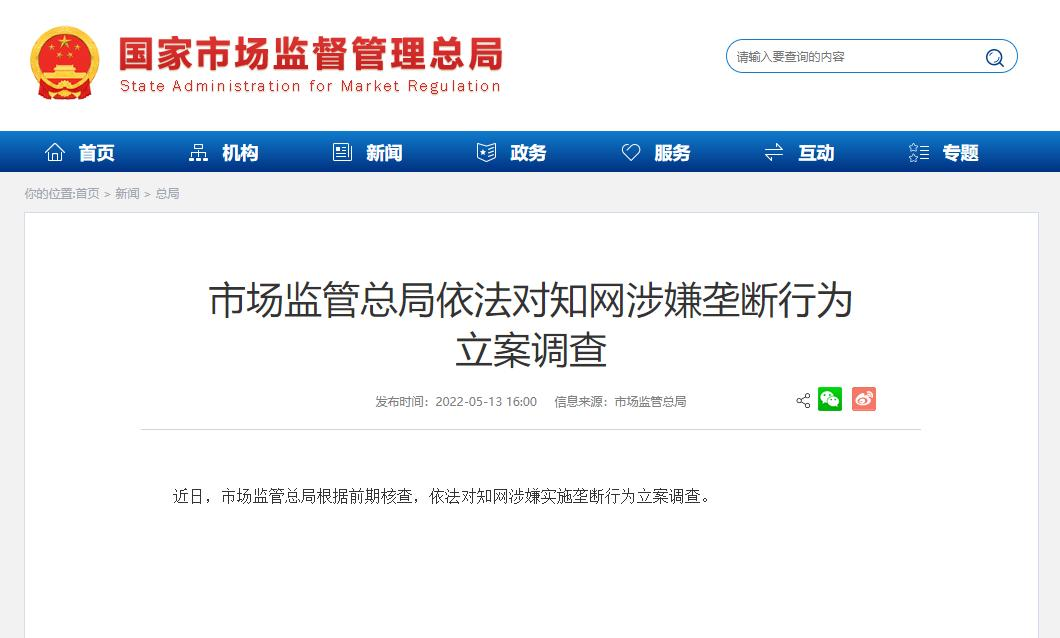 5月13日晚间,市场监管总局给同方股份的子公司“知网北京”和“知网数字出版社”发出《国家市场监督管理总局垄断案件调查通知书》,并表示近期注意到关于知网垄断对相关事宜,正在对其进行反垄断调查。