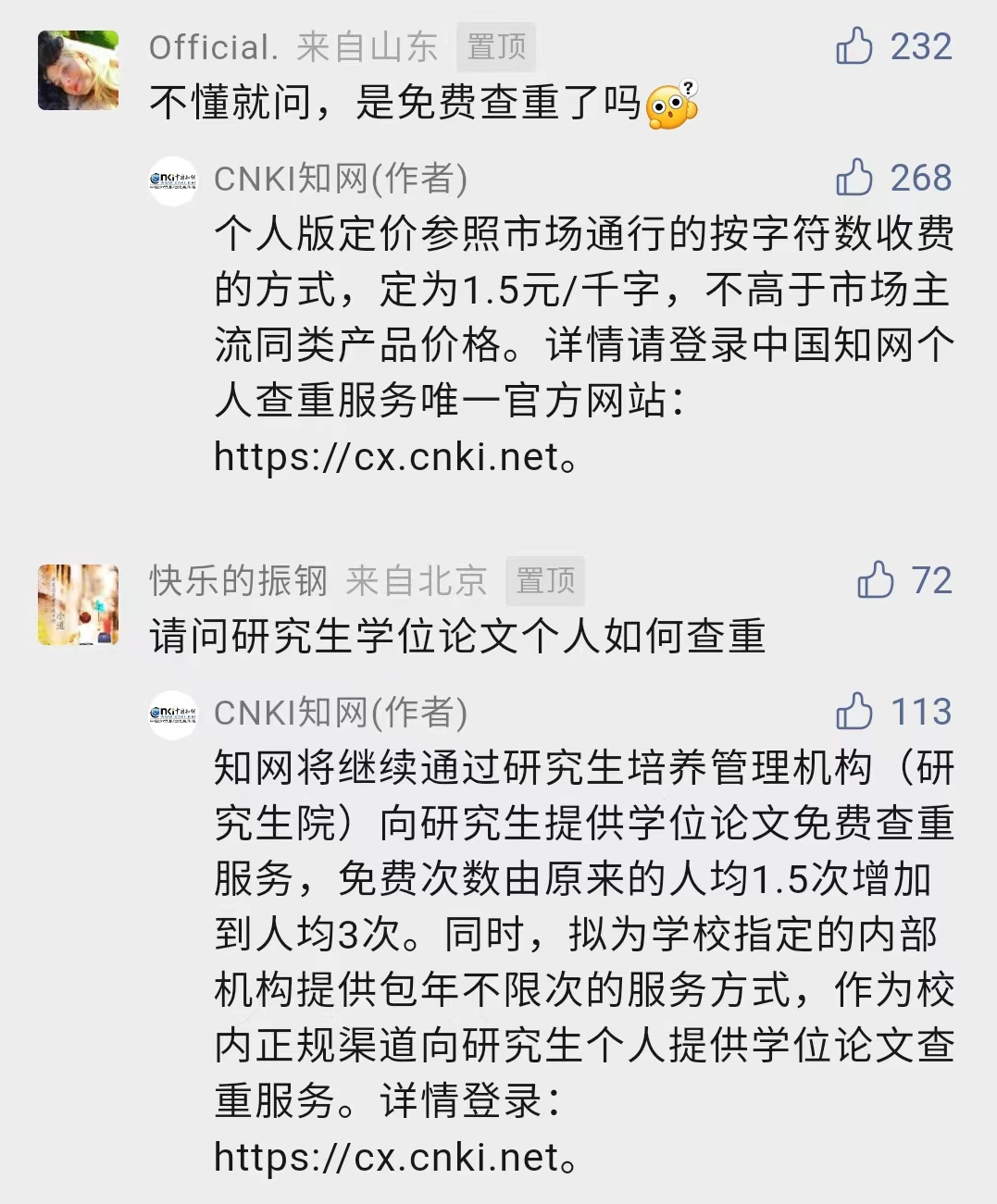 对个人用户提供服务的价格也非常优惠,相比以往查重动辄要几百乃至上千,现在只需要1.5元/千字,不高于市场主流同类产品,按照一万字的论文查重三次算,只需要45元。研究生们虽然享受不到这个价格,但知网也承诺拟为学校指定的内部机构提供包年不限次的服务方式,作为校内正规渠道向研究生个人提供学位论文查重服务,研究生学位论文免费查看的次数也会增加。