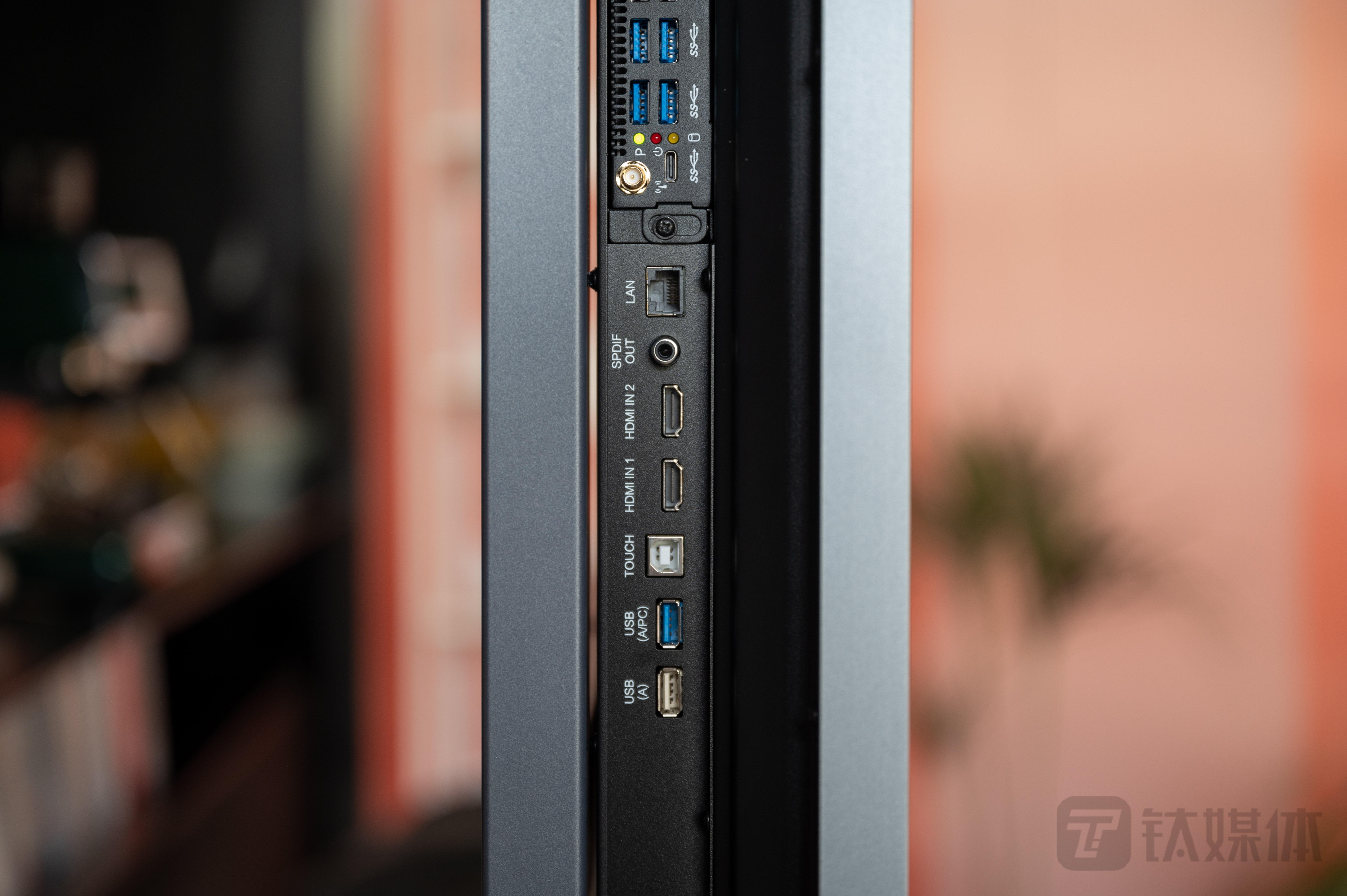 机身正面还有很多的细节设计,比如左侧底部拥有USB Type-A以及USB Type-C接口,这样在播放PPT或者其他文件的时候,就可以直接接入而不需要去机身侧面再次寻找接口。而且USB Type-C接口也是目前大屏当中少有的接口配置,但在笔记本电脑中已经成为了标配设计。