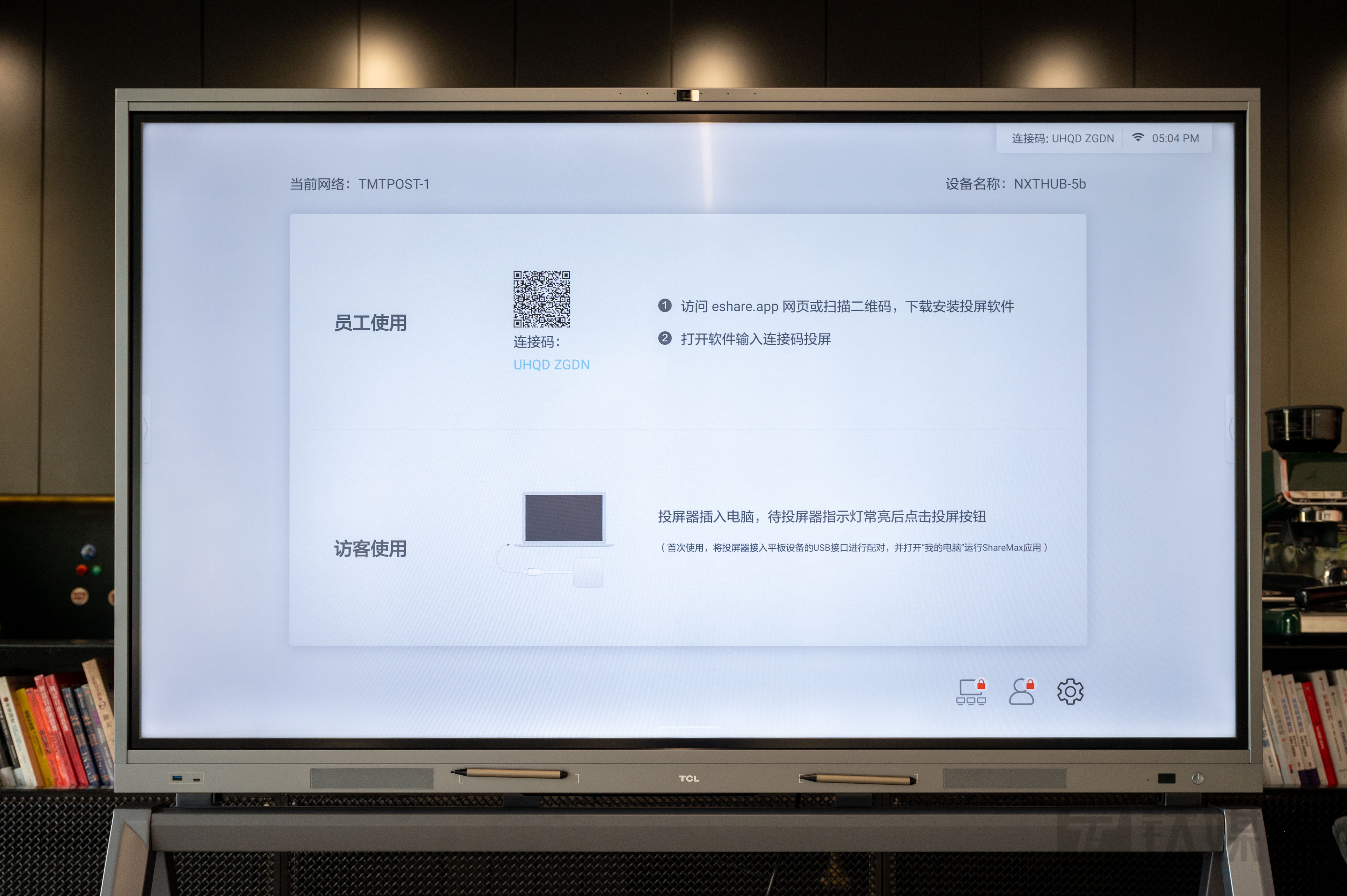 如果你的设备没有接入公司的无线网络当中,TCL也提供了用于投屏的硬件产品,只需要连接电脑并安装里面自带的软件即可实现投屏,相较于WIFI的投屏方案,基于硬件联网的投屏更加适合私密的会议或者是访客进行使用,可以进一步降低数据风险。