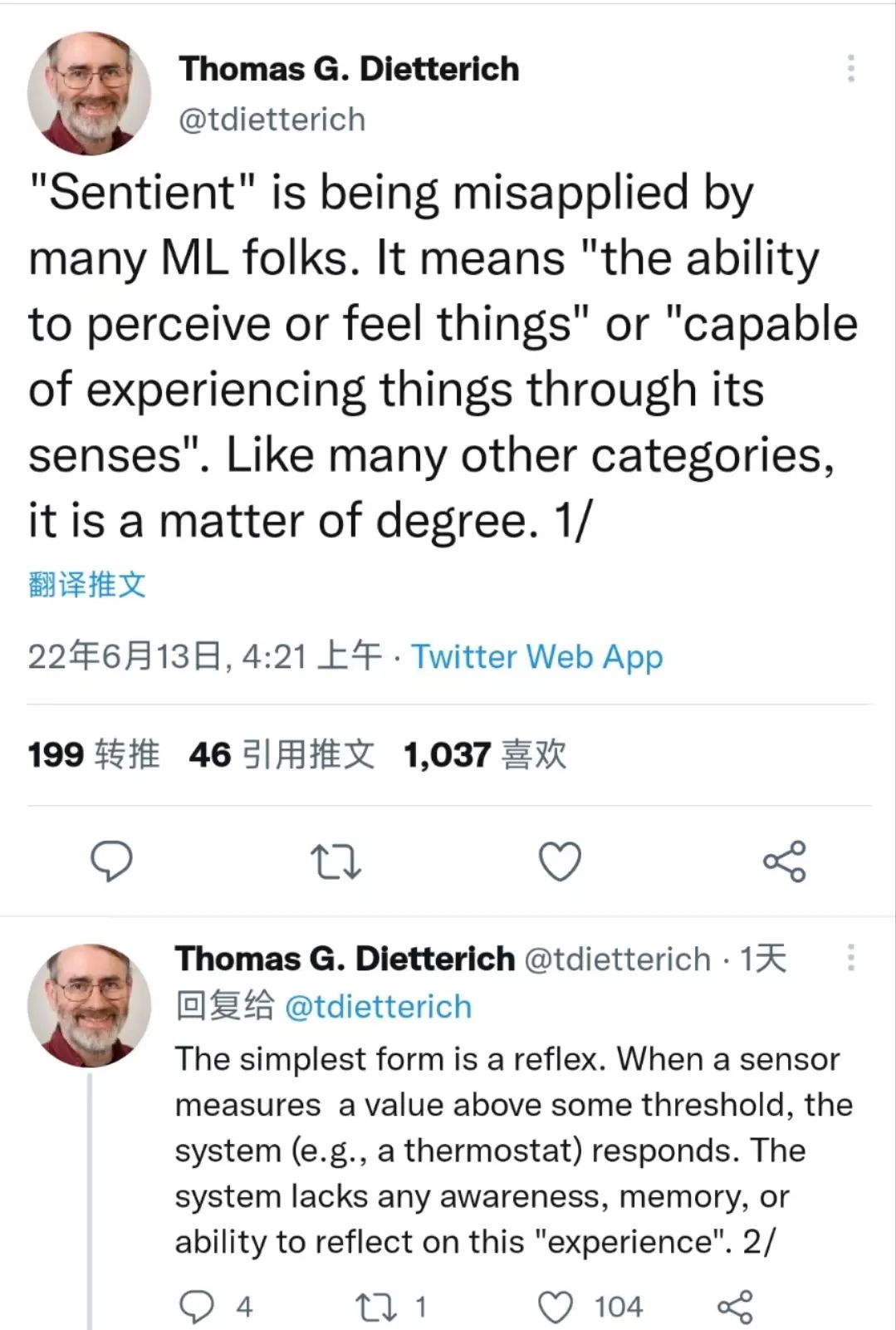 他还转发了另一位专业人士美国人工智能协会前主席托马斯·G·迪特里希(Thomas G.Dietterrich)的观点并深表认同。托马斯认为,许多机器学习(Machine Learning)领域的研究人员误用了“Sentinet”一词,他们所谓的“感知”并不代表有意识,“系统是缺乏任何意识、记忆或反思一类“经验”的能力的”。