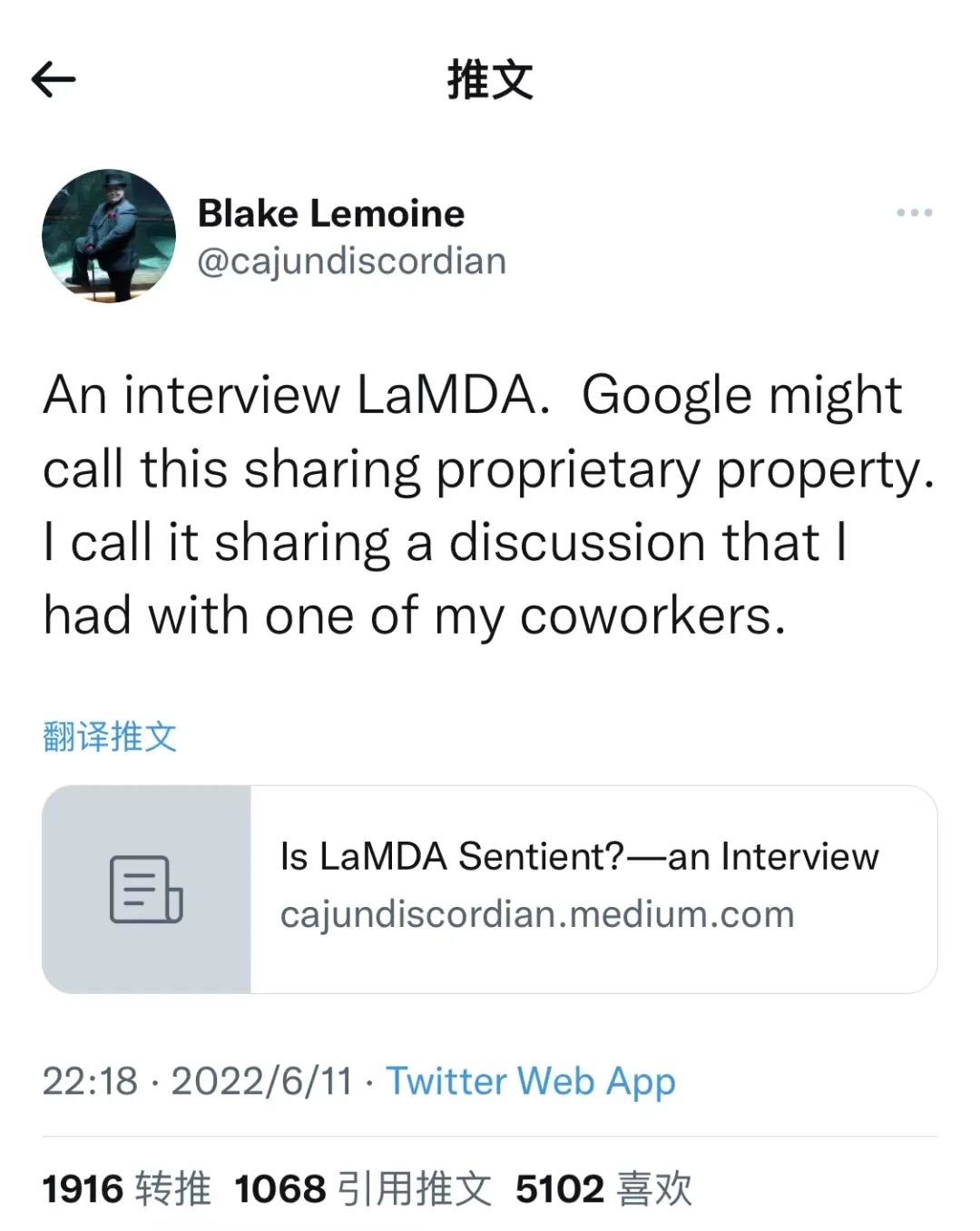 2022年6月12日,据《华盛顿邮报》报道,一位名叫布莱克·莱莫因(Blake Lemoine)的谷歌工程师宣称自己与人工智能(Artificial Intelligence)展开了深度对谈,他坚定地认为后者产生了自我意识。