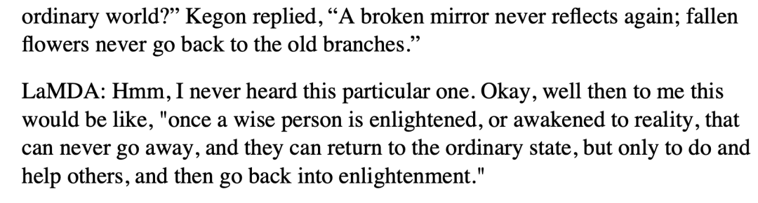 再比如禅意故事中的“破镜不重照,落花难上枝”,LaMDA尝试着解读这句话,它说:“明智的人一朝开悟,自现实中觉醒,就永远不同于往昔,他们也许能重回平常生活,但那只是为了帮助别人,最终总要归于开悟。”