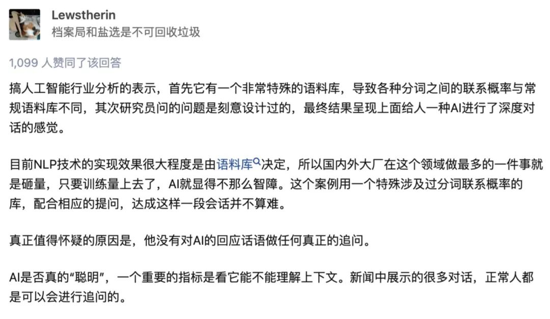 人工智能行业从业者、知乎答主Lewstherin在相关回答中表示,LaMDA背后的语料库非常特殊,再辅以研究者(布莱克)刻意设计过的问题,最终促成了这场深度对话。