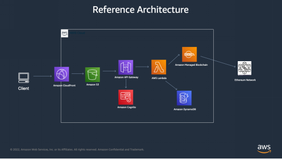 第一层是表示层,相比于阿里云简单的存储功能,其可以直接在AWS服务器上部署代码,提供NFT市场用户界面。同时会为资产生成一个唯一的ID,传递给智能合约。