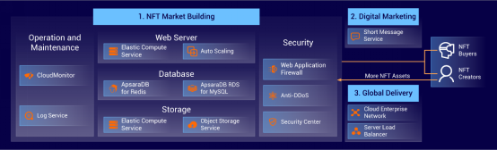 根据阿里云官网发布过的信息,其NFT解决方案分为三步:市场建设-数字营销-全球交付。