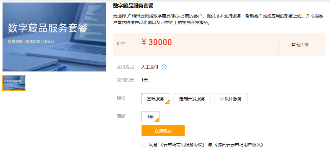 偲睿咨询发现,腾讯云官网“数字藏品服务套餐”显示,基础服务一年收费3万元,提供产品功能以及UI界面上的定制开发。