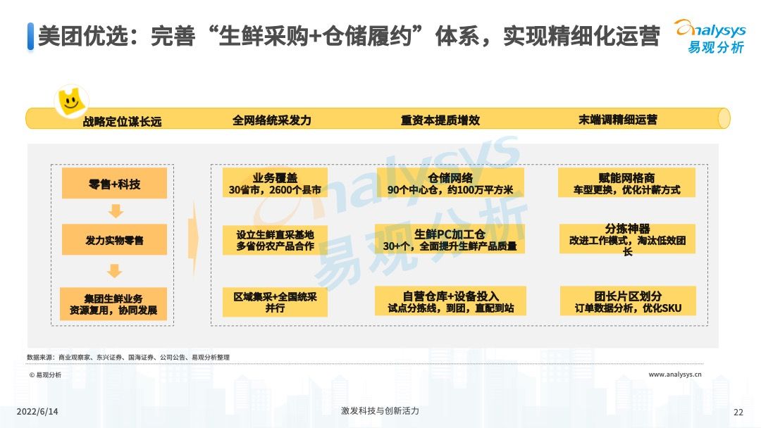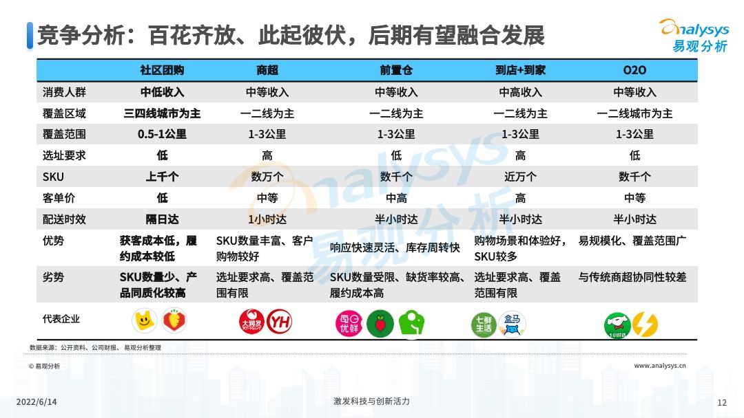 在风险资金和产业资本的助力,市场竞争白热化,无序化,监管强化,市场整合加快,行业出清,初步呈现强者恒强的态势,头部的厂商逐渐回归零售业正常发展状态,聚焦冷链仓储等基础设施建设,保障生鲜产品的质量,提高服务水平。长期看,厂商通过内部资源整合,资源协同,融合发展,全力开拓数十万亿级下沉零售大市场。