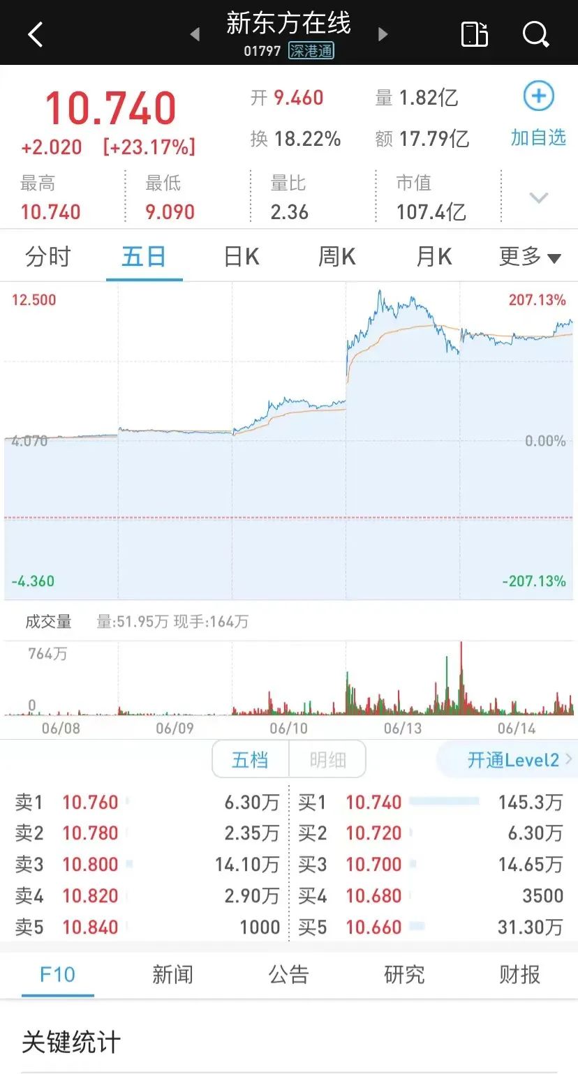 港股新东方在线股价自6月10日开启上涨行情,股价从4.470元开始攀升,6月13日盘中一度实现100%增长最高达12.5港元/股,新东方在线母公司新东方当日涨幅也达到25%。截至6月14日收盘,新东方在线股价上涨23.17%达10.740港元/股。