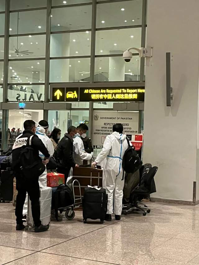 2022年2月,肖龙和同事在伊斯兰堡国际机场排队入境
