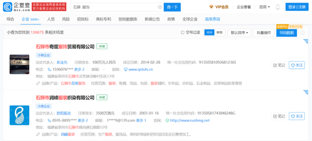 在企查查上搜索“石狮、服饰”,出现了近14万条结果