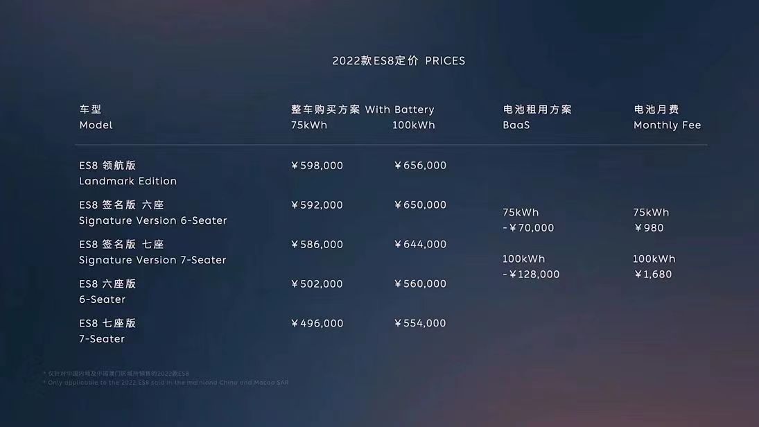 ES7是蔚来NT2第二代技术平台的首款SUV,补贴前标准续航电池包起售价46.8万元;长续航电池包52.6万元起;首发版为54.8万元,BaaS方案补贴前起售价42万元。即日起于蔚来APP开放预订,预计2022年8月28日开启交付。