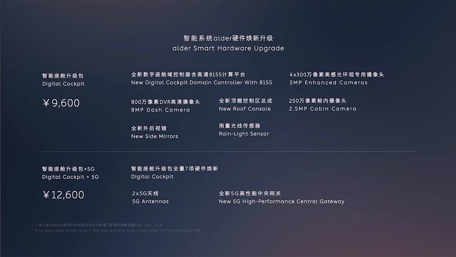 智能系统Alder·赤杨硬件焕新升级售价9600元;选装5G高性能中央网关后的价格为12600元。2022款ES8、ES6、EC6全面升级蔚来Alder·赤杨智能系统。