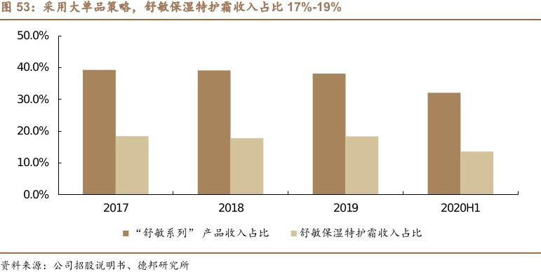舒敏系列中的大单品舒敏保湿特护霜,销售收入占主营业务收入比重分别为 18.37%、17.77%、18.36%。