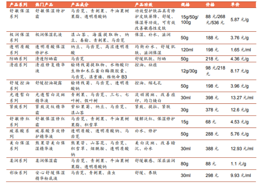 核心品牌薇诺娜13大系列产品分布,来源:申港证券研究院