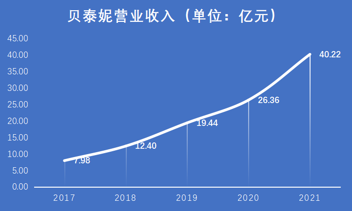 而贝泰妮的营收,也从2017年的7.98亿上升到2021年的40.22亿,四年增长5倍。