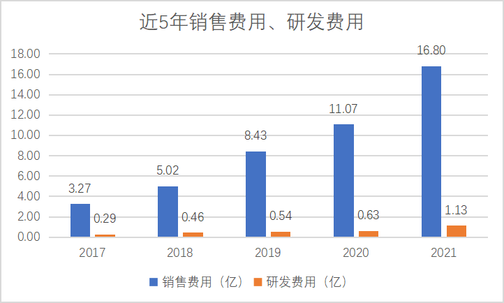 控价的另一面,是不惜下血本做营销。2021年,公司销售费用16.8亿,同比增加51.81%,公司营收40.22亿,同比增加52.57%,可以说,每拉动2.4元的销售增长,就需要花1块钱。