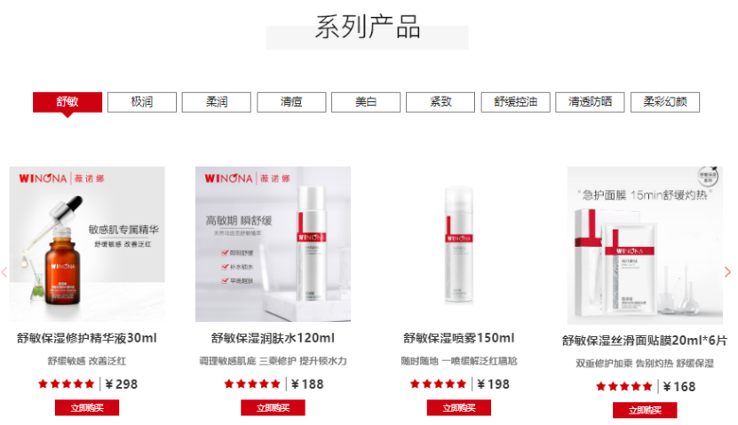 薇诺娜品牌有六个系列,舒敏系列是其中之一。