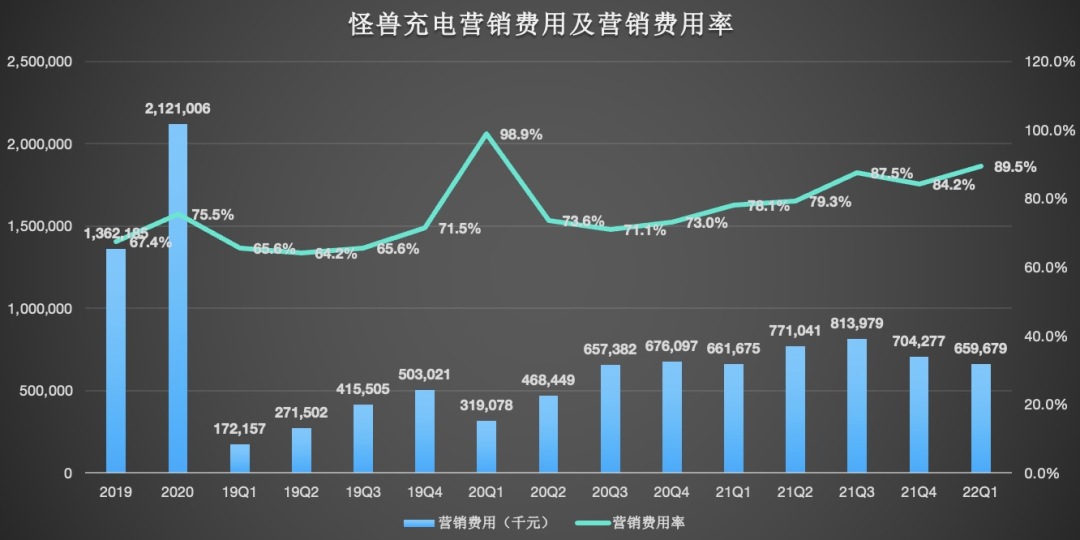 数据显示,2022年Q1,怪兽充电的营销费用为6.597亿元,较上年同期的6.617亿元,减少0.3%,较上一季度的7.043亿元,减少6.3%。不过值得一提的是,虽然整体上营销费用的增长有所放缓,但其营销费用率却在大幅增长,从上年同期的78.1%上升至本季度的89.5%。