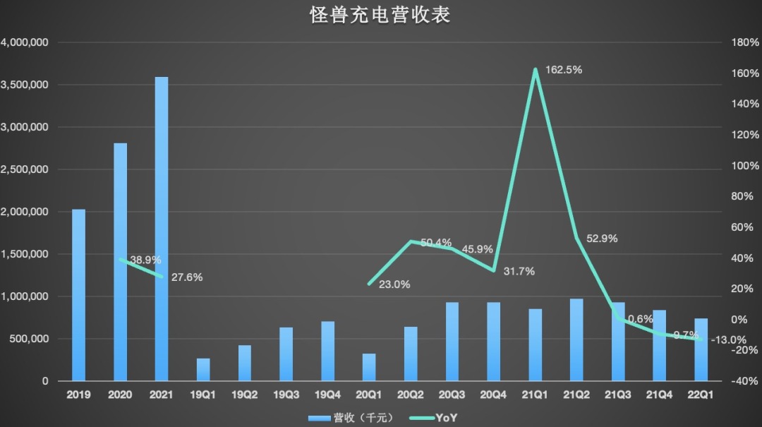 数据显示,2022年Q1,怪兽充电实现7.371亿元的营收,相比上年同期的8.469亿元,下滑13%,较上一季度的8.362亿元,下滑12%。
