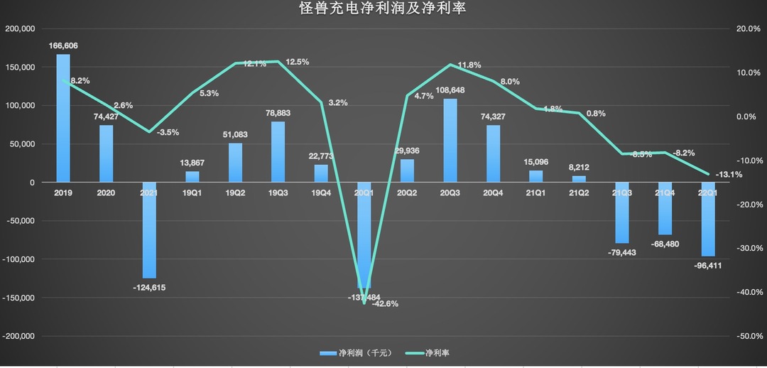 数据显示,2022年Q1,怪兽充电净亏损9641万元,而上年同期的净利润为1510万元。事实上,怪兽充电已连续3个季度亏损,且呈现扩大的趋势。