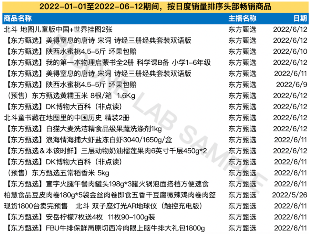 在选品较少并且一天10多个小时的直播时长下,话术重复是再正常不过的事情。不过,《豹变》经过搜索发现,相较于最初的农副产品,东方甄选的选品品类在不断丰富,目前直播间中已经从粮油、水果生鲜、海鲜食品延伸到零食、日化、乐器等领域。6月16日直播间选品将近100个。![]()