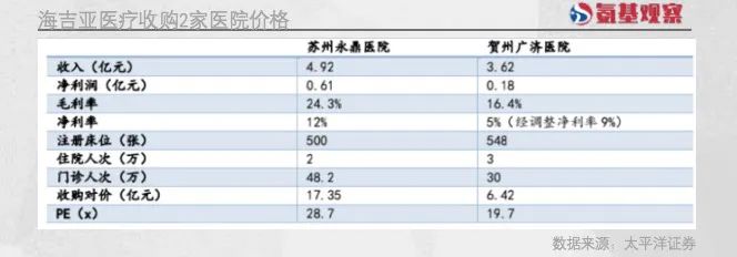 相比之下,并购更直接、速度更快,但也需要更厚实的家底。如下图所示,海吉亚医疗并购苏州永鼎医院,对应的价格高达17.35亿元;贺州广济医院相对便宜,但也要6.42亿元。